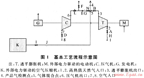 調(diào)壓站內(nèi)天然氣熱值自平衡技術(shù)基本工藝流程如圖1所示。它利用透平膨脹機(jī)代替?zhèn)鹘y(tǒng)調(diào)壓設(shè)備將高壓天然氣降壓[3],并將此過程的壓力能轉(zhuǎn)化成驅(qū)動能,帶動壓氣機(jī)生產(chǎn)壓縮空氣[4~5]摻混到已降壓的高熱值天然氣中,使調(diào)壓站出站天然氣熱值得以降低,其壓力等各項(xiàng)技術(shù)參數(shù)均與目標(biāo)值一致。一般情況下,此過程不需要外部動力驅(qū)動壓氣機(jī),而是回收利用“與生俱來”的天然氣壓力能。