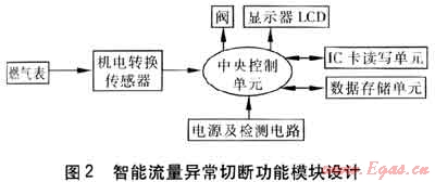 中央控制單元是安全智能燃?xì)獗淼暮诵?。通過(guò)IC卡讀寫(xiě)單元將民用燃?xì)猱惓A髁繀?shù)傳入燃?xì)獗淼闹醒肟刂茊卧?,并保存到?shù)據(jù)存儲(chǔ)單元中,作為異常流量的判斷依據(jù)。當(dāng)前的瞬時(shí)流量信號(hào)從燃?xì)獗硗ㄟ^(guò)機(jī)電轉(zhuǎn)換傳感器讀入到中央控制單元后,由中央控制單元計(jì)算出當(dāng)前燃?xì)獗淼乃矔r(shí)流量值,并與異常流量范圍進(jìn)行比較。當(dāng)確認(rèn)流量異常時(shí),中央控制單元發(fā)出關(guān)閥操作信號(hào),閥門(mén)關(guān)閉,顯示器顯示異常提示,并形成記錄,通過(guò)TC卡或無(wú)線形式反饋到管理系統(tǒng),供故障分析。