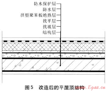 對于占17.5%的平屋頂,通常采用的絕熱措施是將熱導(dǎo)率小、吸水率低并具有一定強(qiáng)度的輕質(zhì)絕熱材料設(shè)置在防水層與找平層之間。改造后的平屋頂結(jié)構(gòu)見圖5。改造后不僅能夠有效控制屋頂傳熱系數(shù),而且能使結(jié)構(gòu)層受到保護(hù)而不致受到過大的溫度應(yīng)力,避免結(jié)構(gòu)層內(nèi)表面結(jié)露甚至結(jié)凍。