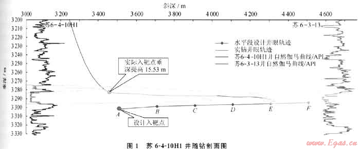 如果設(shè)計靶點低于實際目標層,在有效地層厚度范圍內(nèi)井斜角達不到工程入靶技術(shù)要求,則存在鉆刻目標層、填井重鉆風(fēng)險。典型井蘇6-4-10H1,設(shè)計靶點在預(yù)測目標層以下15.53m,發(fā)現(xiàn)后及時上調(diào)入靶點,最終使該井成功入靶(圖1)。