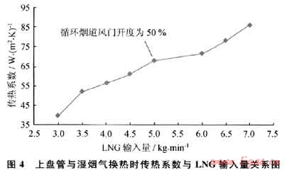 圖4為上盤管與濕煙氣換熱時(shí)傳熱系數(shù)與LNG輸入量的關(guān)系圖。反映了當(dāng)燃料天然氣輸入熱負(fù)荷不變、循環(huán)煙道調(diào)風(fēng)門的開度為50%時(shí),濕煙氣與上盤管換熱的傳熱系數(shù)與LNG輸入量之間的關(guān)系,此時(shí)上盤管外濕煙氣量基本不變,傳熱系數(shù)的變化主要由管內(nèi)LNG的對(duì)流換熱系數(shù)決定。隨著LNG輸入量的增大,其管內(nèi)流速上升,導(dǎo)致上盤管傳熱系數(shù)增大,且隨著LNG輸入量的增大,在輸入熱負(fù)荷不變時(shí),其溫升下降,從而增大了管內(nèi)外的傳熱溫差,促進(jìn)了傳熱。
