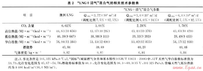 以沼氣產(chǎn)量為3000m3/d時,典型組分的沼氣與澳大利亞LNG氣混配為例,不同比例情況下的“LNG+沼氣”混合氣熱值、C02含量及燃燒特性參數(shù)見表2。