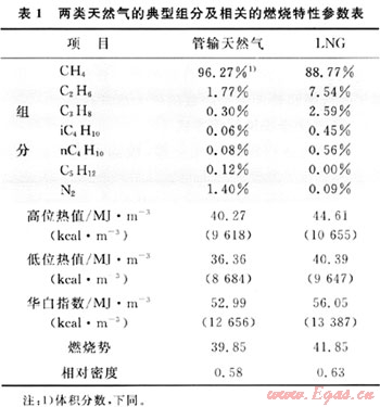 按照行業(yè)習(xí)慣,一般來說,天然氣被分為兩大類別:①管輸天然氣;②液化天然氣。兩類天然氣的典型組分及相關(guān)的燃燒特性參數(shù)如表1所示。