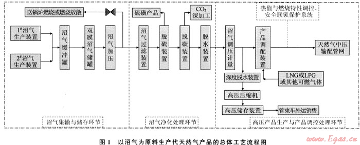 以沼氣為原料生產(chǎn)代天然氣產(chǎn)品的總體工藝流程如圖1所示。