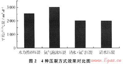采用4種壓裂方式的壓裂效果對(duì)比如圖2所示。從圖2中可以看出:氮?dú)馀菽瓑毫研Ч詈?,壓裂井的平均產(chǎn)氣量為3 037.47m3/d;其次是活性水加砂壓裂壓裂的井,平均產(chǎn)氣量為2540.77m3/d;清水+氮?dú)鈮毫?、清水加砂壓裂效果相差不大,分別為2010.53m3/d和1998.88m3/d。