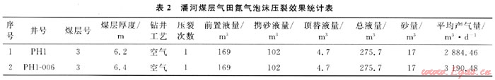 潘河煤層氣田采用氮?dú)馀菽瓑毫训?口井均已投入排采并產(chǎn)氣,其統(tǒng)計(jì)數(shù)據(jù)如表2所示。根據(jù)統(tǒng)計(jì),2口井采用氮?dú)馀菽瓑毫押笃骄a(chǎn)氣量為3037.47m3/d,增產(chǎn)效果顯著。