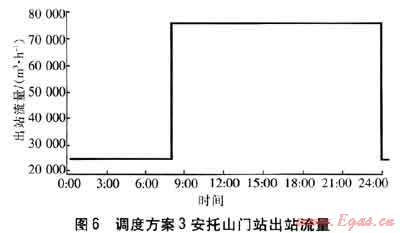 調(diào)度方案3:在安裝了流量遙調(diào)系統(tǒng)情況下,設(shè)定用氣高峰時段安托山門站最大供氣流量為7.5×104m3/h,不超過上游合同要求的最大小時提取速率。為使次高壓管網(wǎng)最大壓力不超過1.55MPa,在次高壓管網(wǎng)的設(shè)計壓力范圍內(nèi),低峰時段應(yīng)進(jìn)行供氣流量的限制。坪山門站出站壓力設(shè)定為1.5MPa,不進(jìn)行流量的遙調(diào)控制。安托山門站出站流量調(diào)整見圖6。