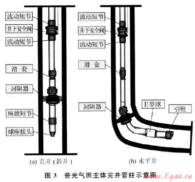 針對(duì)氣田硫化氫分壓高、生產(chǎn)井段長及儲(chǔ)層非均質(zhì)性強(qiáng)的特點(diǎn),模擬普光氣田的工況條件,進(jìn)行不同材質(zhì)腐蝕評(píng)價(jià)實(shí)驗(yàn),優(yōu)化設(shè)計(jì)配套了生產(chǎn)完井一體化管柱(圖3),進(jìn)行雙向雙效、多級(jí)壓力延時(shí)起爆技術(shù)攻關(guān),開展抗硫耐溫酸液體系、多級(jí)注入+閉合酸壓及暫堵工藝研究,有效地改造了Ⅱ、Ⅲ類儲(chǔ)層,提高了氣藏的動(dòng)用程度和單井產(chǎn)能[8]。