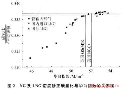 對華白指數(shù)限定范圍的控制是天然氣利用的安全性、環(huán)境排放和效率的保證。燃氣的碳氫比數(shù)決定了不完全燃燒指數(shù)的大小或燃燒的C0排放量。圖2給出了相對密度修正的碳氫比和華白指數(shù)的關(guān)系。由此可見控制華白指數(shù)范圍與控制碳氫比的變化一樣,具有限定不完全燃燒指數(shù)或黃焰指數(shù)的同樣功效。圖2中GS(M)R是英國燃氣安全管理規(guī)范“Gas Safety(Management)Regulations”的縮寫。