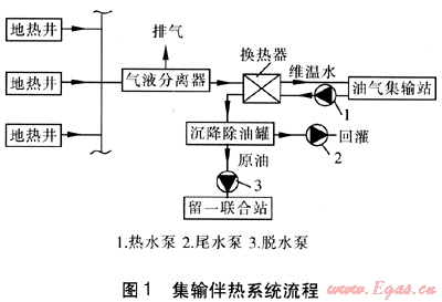 留北潛山油藏是一個已進(jìn)入特高含水開發(fā)階段的油田,油井采出液溫度為100~130℃,含水率很高。將其改成為地?zé)崽嵋壕?,利用采出的地?zé)崴疅崮埽瑢崿F(xiàn)油氣集輸站油氣集輸伴熱系統(tǒng)的維溫,達(dá)到熱、油聯(lián)產(chǎn)和地?zé)豳Y源的有效開發(fā)利用[1]。
