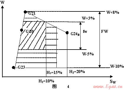 例如英國經(jīng)過流動試驗室對1200個天然氣燃具進(jìn)行試驗,發(fā)現(xiàn)華白數(shù)每遞增1.5MJ/m3,熱水器與鍋爐煙氣中的CO含量大約增加1倍。因此決定燃?xì)饣Q域的華白數(shù)上限為3%,下限為-5%。非正常的界限為:上限8%;下限-10%。英國使用SNG(代用天然氣),需要用IGU的析碳界限氣G24B檢驗。為了避免析碳,英國要求界限氣中H2含量正常界限為10%,非正常界限為15%。同時利用W-SW燃?xì)饣Q圖表達(dá)了燃?xì)饣Q域(見圖4),已經(jīng)把IGU規(guī)定的G24B和歐共體的G222排除在外。圖4中的斜線為正?;Q域??梢娪烊粴獾幕Q域小于IGU和歐共體的天然氣分類的范圍。如果考慮燃?xì)鉄嶂挡辉试S變化過大時,燃?xì)饣Q域,還要進(jìn)一步縮小。實際上,燃?xì)饣Q域是根據(jù)燃具的適應(yīng)域等因素決定的,當(dāng)時英國燃具的抗析碳的能力差,縮小了互換域。以上是上個世紀(jì)英國使用含H2多的SNG(代用天然氣)作為補(bǔ)充氣源的情況[11]。由此可見,界限氣只是給出了互換域邊界的輪廓不等于互換性已經(jīng)解決。