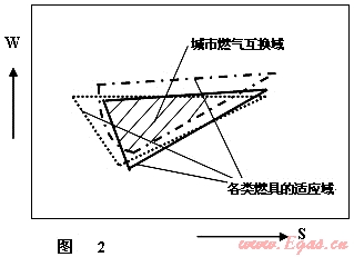 2. 城市燃?xì)饣Q域:一個城市有多種不同用途的燃具。每種燃具都有自己的燃具適應(yīng)域。將這些適應(yīng)域,集中在一個坐標(biāo)圖上(見圖2),就可以得到中間斜線的燃?xì)饣Q域。城市供應(yīng)的燃?xì)獗仨氃谶@些燃具的適應(yīng)域的范圍內(nèi)??梢娙?xì)饣Q域是受燃具適應(yīng)域制約的。其實互換性和適應(yīng)性的目的都是保證燃具正常工作,是一個事物的兩個方面?;Q性是對城市燃?xì)庹f的;適應(yīng)性是對燃具說的。在討論時不要混淆。