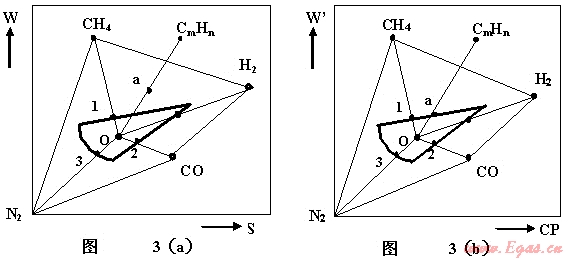 目前,對燃燒勢(Combustion Potential)CP有不同的理解。最可靠的解釋還應(yīng)該以德爾布博士在同濟(jì)大學(xué)講課的內(nèi)容為準(zhǔn)。上個世紀(jì)同濟(jì)大學(xué)請來德爾布先生來華講學(xué),還印發(fā)了講課的講義[2]。德爾布先生從大氣式燃燒的穩(wěn)定性講起,最后介紹了燃燒勢的產(chǎn)生過程。 德爾布的研究組,開始是使用的是以華白數(shù)為縱坐標(biāo),燃燒速度為橫坐標(biāo)的坐標(biāo)圖,經(jīng)過試驗在此坐標(biāo)圖上點出回火、離焰和CO/CO2超標(biāo)曲線(簡稱CO曲線)。但是當(dāng)氣源發(fā)展到使用油制氣后,以燃燒速度為橫坐標(biāo)的坐標(biāo)圖上得不到光滑的CO曲線,參見圖3(a)。圖中的a點沒有落在曲線1上。這是由于燃燒速度不能全面反映CO曲線的結(jié)果。為此需要一個能反映離焰、回火及CO曲線的參數(shù)(或指數(shù))來代替燃燒速度S。于是研究組通過大量試驗整理出燃燒勢CP的公式。將CP 代替S后,得到光滑曲線(具體做法參考[2]、[4])。在W’-CP的圖3(b)中,a值落在曲線1上。說明燃燒勢,不僅反映了離焰、回火,同時還反映了CO曲線。這就是燃燒勢的物理背景[3]。