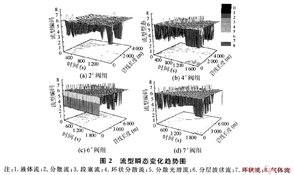 2) 清管過程中出現(xiàn)的主要流型為:段塞流、分散流、分散光滑流、分層波狀流和環(huán)狀流。