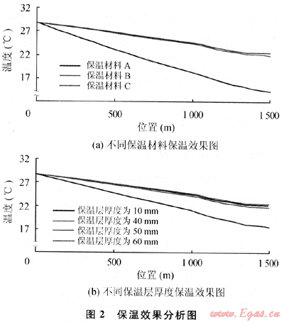 對材料B分別進行保溫厚度的敏感性分析,分析結(jié)果如圖2(b)所示。由圖可知:不同材料沿程溫度變化規(guī)律基本一致,但保溫材料傳熱系數(shù)越大,沿程溫度變化越明顯;隨著保溫層厚度的增加,保溫效果越好,但當(dāng)保溫層厚度增加到一定值時,保溫效果的增加程度不明顯。