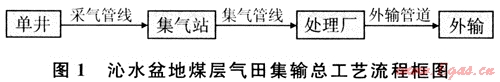 為了更好地開發(fā)建設(shè)沁水盆地煤層氣氣田,我們依據(jù)開發(fā)方案、煤層氣性質(zhì)、當(dāng)?shù)刈匀粭l件以及商品氣需求和流向等,并借鑒長(zhǎng)慶氣區(qū)蘇里格氣田天然氣集輸工程的實(shí)踐經(jīng)驗(yàn),制定了沁水盆地煤層氣田地面集輸總工藝流程[1],如圖1所示。為了更深入地了解沁水盆地煤層氣田地面集輸工藝特點(diǎn),以蘇里格氣田天然氣集輸工程為對(duì)比,重點(diǎn)介紹了沁水盆地煤層氣田開發(fā)方案所提供的氣井基本參數(shù)、地面建設(shè)采用的井場(chǎng)、采集系統(tǒng)、集氣站場(chǎng)及處理廠工藝。