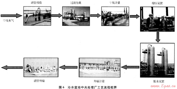 原料氣進(jìn)廠前設(shè)緊急截?cái)嚅y,可在中央處理廠或集氣干線緊急情況下的自動(dòng)切斷。氣體先進(jìn)入集氣裝置經(jīng)過濾分離器分離出攜帶的液體及粉塵等雜質(zhì),經(jīng)計(jì)量后輸往增壓裝置,再進(jìn)入脫水裝置,脫水后的凈化氣計(jì)量后去輸氣管道首站進(jìn)入就近的西氣東輸主管道。沁水盆地中央處理廠工藝流程框圖見圖6。