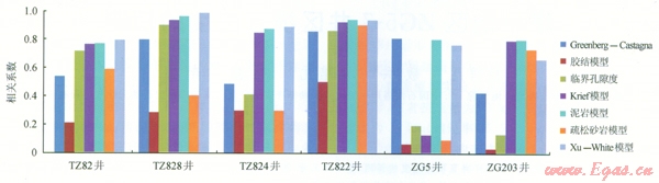圖2 各種模型實(shí)測橫波與預(yù)測橫波相關(guān)系數(shù)圖