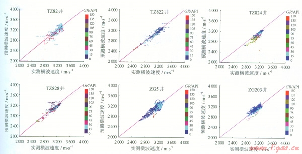 圖3是利用Xu—White模型法對塔中地區(qū)6口井的橫波曲線擬合的實(shí)驗(yàn)結(jié)果。從圖3中可以看出: