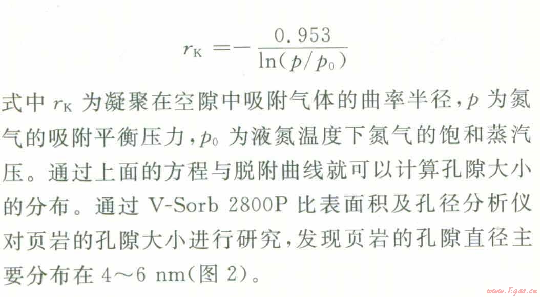 孔隙按大小可分為大孔(直徑大于50 nm),介孔(直徑介于2~50 rim)、微孑L(直徑小于2 nm)。利用氣體在頁巖孑L隙中的吸附與解吸可以測(cè)量其孔隙大小及其分布情況,當(dāng)壓力低于氣體的臨界壓力時(shí),對(duì)于介孔與大孔,首先發(fā)生多層吸附,相對(duì)壓力更高時(shí),則發(fā)牛毛細(xì)管凝聚,形成類似液體的彎液面。介孔孔徑分布一般用Kelvin方程進(jìn)行計(jì)算。以氮?dú)庾鳛槲綒怏w時(shí),當(dāng)液氮溫度為77 K時(shí),Kelvin方程可表述如下:
