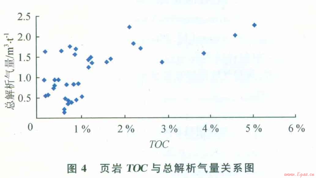 圖3是頁巖氣的總解析氣量與頁巖的孔隙度的關(guān)系圖,從圖中可以看到該頁巖氣藏的孔隙度與總解析氣量并沒有明顯關(guān)系。圖4是頁巖的總解析氣量與TOC關(guān)系圖,從圖中可以看到兩者存在著明顯的正相關(guān)關(guān)系,隨著頁巖的有機(jī)質(zhì)含量的增加,頁巖的總解析氣量也是增加的。美國(guó)5大頁巖具有豐富的有機(jī)質(zhì)含量,其TOC大多介于l.5%~20%,通常認(rèn)為總有機(jī)質(zhì)含量超過0.5%的頁巖是具有潛力的烴源巖。通過對(duì)該頁巖氣藏巖心的有機(jī)地化分析,其TOC介于0.5%~5%,其TOC使其可能成為具有潛力的烴源巖。根據(jù)美國(guó)和加拿大的勘探開發(fā)結(jié)果,對(duì)于熱成因的頁巖氣藏,形成頁巖氣的頁巖有機(jī)質(zhì)成熟度(R。,)值為0.4%~3.o%。陔頁巖氣藏的R。值范圍為2.75%~3.92%,R。值超過3%說明處于過成熟范圍,會(huì)影響頁巖氣體的吸附量。