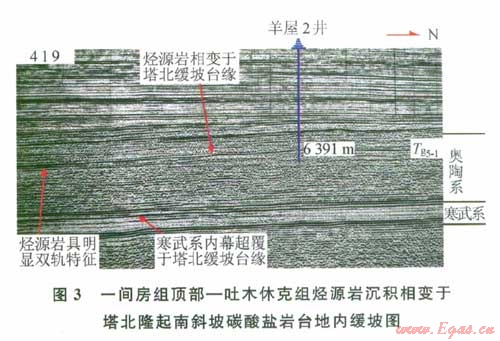 但是,通過對(duì)經(jīng)過羊屋2井地震剖面(測(cè)線419)的精細(xì)分析(圖3),發(fā)現(xiàn)在羊屋2井南部3 km處存在同相軸Tg5-1及其下面的“雙軌”變“單軌”的巖性相變反射,即代表著上奧陶統(tǒng)良里塔格組石灰?guī)r頂面Tg5-1之下的強(qiáng)反射軸發(fā)生相變。同時(shí)經(jīng)多條地震剖面相互閉合、連接確認(rèn),此發(fā)生相變的“雙軌”同相軸與過塔中29井烴源巖發(fā)育位置的強(qiáng)相位反射顯示的是同一套地層發(fā)射。據(jù)此認(rèn)為,中上奧陶統(tǒng)一間房組頂部—吐木休克組烴源巖沉積相變于塔北隆起南斜坡羊屋2井南3 km處的碳酸鹽巖臺(tái)地內(nèi)緩坡。