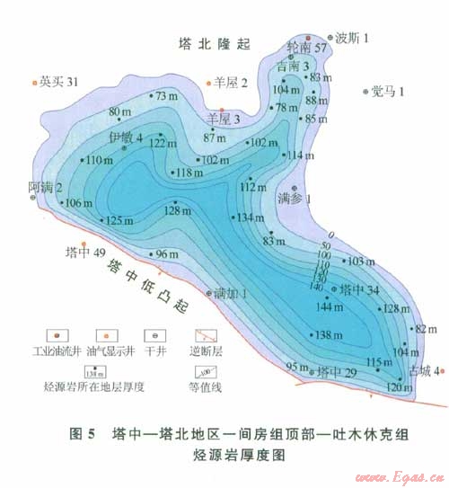 從圖5可知,此套烴源巖在呈近北西方向上沉積厚度較大,說明在中奧陶世晚期—晚奧陶世早期,塔北隆起塔中地區(qū)沉積水體較深且為沉積凹陷區(qū)。由圖2與圖3可知,代表石灰?guī)r沉積頂面的地震反射同相軸Tg5-1僅為巖性反射界面,其也是一個(gè)穿時(shí)界面。反射同相軸Tg5-1在滿加1井及塔中低凸起、羊屋2井及輪南地區(qū)則是上奧陶統(tǒng)良里塔格組頂面反射,而在烴源巖發(fā)育的阿—滿過渡帶則代表中奧陶統(tǒng)一間房組頂面(含上奧陶統(tǒng)吐木休克組)。