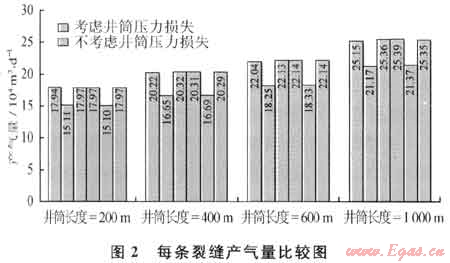 圖2為壓開3條裂縫的水平井在不同井筒長度情況下每條裂縫產(chǎn)氣量的比較:端部裂縫的產(chǎn)氣量高于中部裂縫的產(chǎn)氣量;不考慮井筒內(nèi)的壓力損失時,裂縫的產(chǎn)氣量呈對稱分布;考慮井筒內(nèi)的壓力損失時,指端裂縫的產(chǎn)氣量有所下降,但仍高于中部裂縫的產(chǎn)氣量。