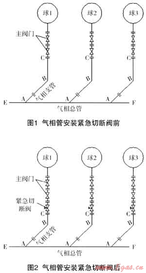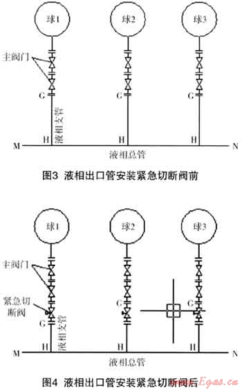 根據(jù)《氣瓶安全監(jiān)察規(guī)定》:《氣瓶充裝許可證》的有效期為4年;有效期滿前,氣瓶充裝單位應當向原審批部門申請更換《氣瓶充裝許可證》。我公司的液化石油氣儲灌站于2011年7月向河北省質(zhì)監(jiān)局提出《氣瓶充裝許可證》的換證申請;河北省特種設備學會于2011年11月對液化石油氣儲灌站進行了現(xiàn)場評審。評審專家根據(jù)新版《城鎮(zhèn)燃氣設計規(guī)范》中關于對“液化石油氣儲罐上安全閥件的配置”,要求我液化石油氣儲灌站3座400m,的液化石油氣球罐的氣相管和液相出口管上的根部主閥門下加裝緊急切斷閥。