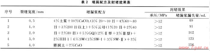 通過材料優(yōu)選確定以GQJ-Ⅱ型、GQJ-Ⅲ型為主要架橋材料,SW-Ⅰ、SW-Ⅱ為纖維材料,不同粒徑的CaC03和云母作為片狀填充材料,并配合高失水劑HH-1及無機鹽Ca0,根據(jù)Howard和Scott的SAN-2工程分布理論[11]確定了各種材料的粒徑級配,形成抗高溫堵漏配方,并用堵漏儀對0.5~4mm之間的縫板進行承壓堵漏效果評價。試驗數(shù)據(jù)見表2,通過實驗數(shù)據(jù)可以看出,不同縫寬下承壓能力均高于12MPa。