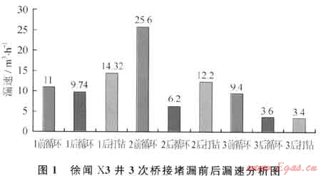 上述3次堵漏前后漏速統(tǒng)計結果如圖1所示,由圖1可知每次橋接堵漏之后循環(huán)時漏速降低,鉆進后漏速增高,說明新鉆地層裂縫、孔隙較為發(fā)育,也存在一定程度的漏失,3次橋接堵漏之后,正常鉆進時漏速由11m3/h降至3.4m3/h,說明橋接堵漏起到了一定的效果。