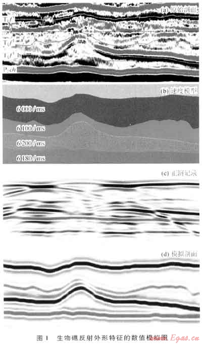 采用相同的方法,對29個不同的生物礁模型進(jìn)行了地震響應(yīng)的數(shù)值模擬,綜合多個模型的數(shù)值模擬結(jié)果可以將生物礁在時間剖面上的特征歸納為以下3項:①外形上,呈丘狀或杏仁狀隆起,兩翼對稱或非對稱;②由于礁體內(nèi)部充填物性的差異,生物礁頂部的反射有時呈強(qiáng)反射,有時也呈弱反射,生物礁內(nèi)部多雜亂反射,隱約成層,反射有時強(qiáng),有時弱;③由于長興組總體上處于海侵期,與生物礁巖隆伴隨的披覆、上超現(xiàn)象明顯。通過上述特征的數(shù)值模擬,為生物礁的地震識別提供了理論依據(jù)。