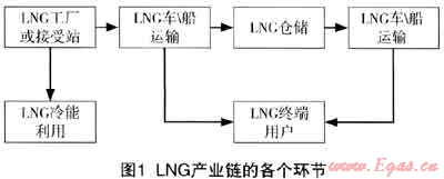 LNG產(chǎn)業(yè)是典型的鏈條產(chǎn)業(yè),從上游的天然氣開采與生產(chǎn)、天然氣液化、LNG貿(mào)易運(yùn)輸?shù)絃NG終端利用,形成了完整的產(chǎn)業(yè)鏈。[3]隨著國內(nèi)經(jīng)濟(jì)的快速發(fā)展,制造業(yè)及社會(huì)消費(fèi)對石油需求日益增大。國家一年多次調(diào)整油價(jià),天然氣與石油等熱值價(jià)格比一直在擴(kuò)大。受供求關(guān)系及市場預(yù)期的影響,進(jìn)口和國產(chǎn)LNG產(chǎn)能將迅速放大,LNG產(chǎn)業(yè)開始進(jìn)入快速發(fā)展的進(jìn)程。LNG產(chǎn)業(yè)的發(fā)展同時(shí)帶動(dòng)了物流業(yè)、深冷設(shè)備制造業(yè)、天然氣發(fā)動(dòng)機(jī)制造業(yè)等國內(nèi)多行業(yè)的發(fā)展。圖1描述了國內(nèi)LNG產(chǎn)業(yè)鏈的各個(gè)環(huán)節(jié)。