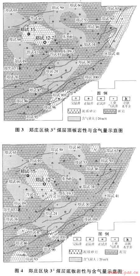 鄭莊地區(qū)3#煤層頂?shù)装鍘r性以泥巖、砂質(zhì)泥巖為主,具備很好的封堵效果,但在鄭試15井-鄭12-7井所在區(qū)域,頂?shù)装寰鶠槟噘|(zhì)砂巖(圖3、4),鄭試61井-鄭試49井區(qū)域,其頂板或底板為泥質(zhì)砂巖,2塊區(qū)域頂?shù)装宓姆舛滦Ч患澳鄮r區(qū)域,導(dǎo)致含氣量(小于15m3/t)與周邊區(qū)域相比較低。