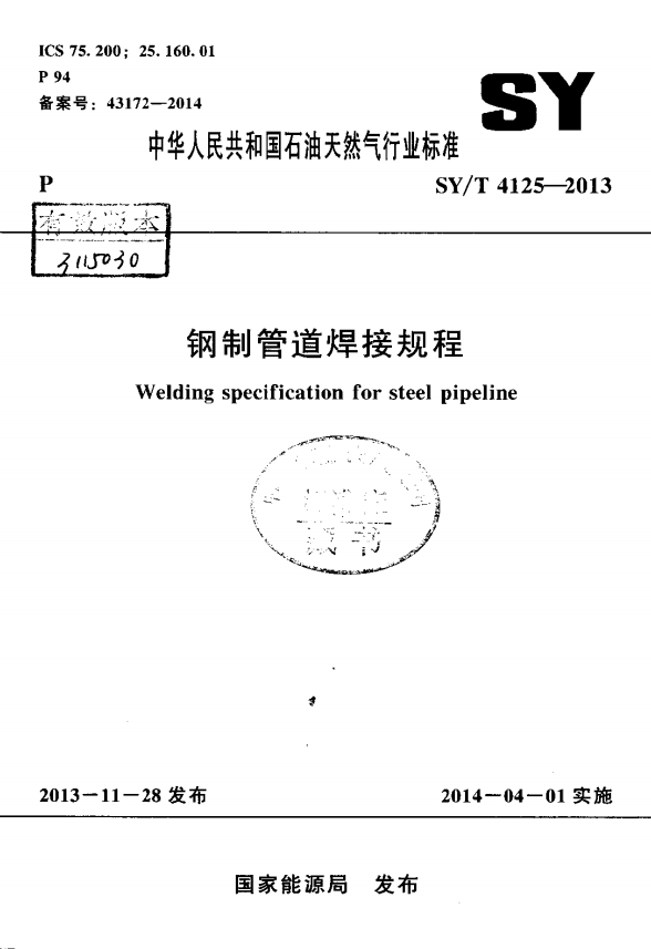 鋼制管道焊接規(guī)程 SY/T 4125-2013 :本規(guī)程適用于輸送介質(zhì)為氣體、液體和漿體的長輸管道及油氣田集輸管道的安裝焊接,管道材質(zhì)為碳素鋼、低合金鋼、奧氏體不銹鋼、不銹鋼復(fù)合管.焊接方法為鎢極氬弧焊、焊條電弧焊、熔化極氣體保護電弧焊(包括自保護半自動焊、氣保護半自動焊、氣保護自動焊)、埋弧焊,以及上述焊接方法相互組合的方法。